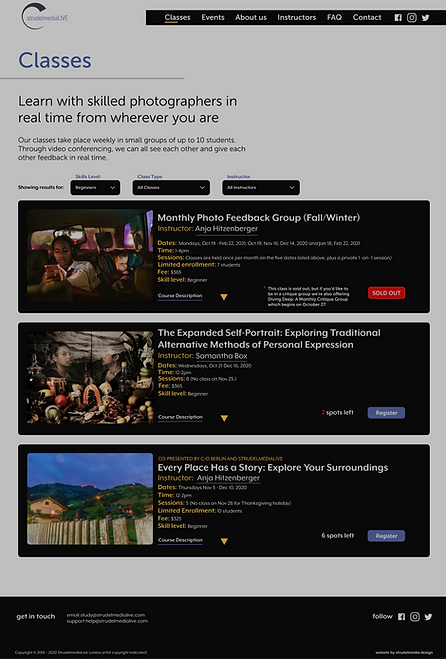 Usability testing revealed a more genuine experience for current and new students visiting the website. The Photo-talks page did not play a significant role in registration or familiarizing oneself with strudelmediaLIVE. Instead, The usability test further underscored that students were concerned with accessing classes based on skill level, previewing teacher bios and classwork, and making efficient purchases.